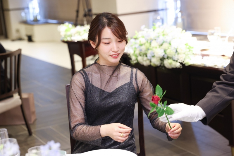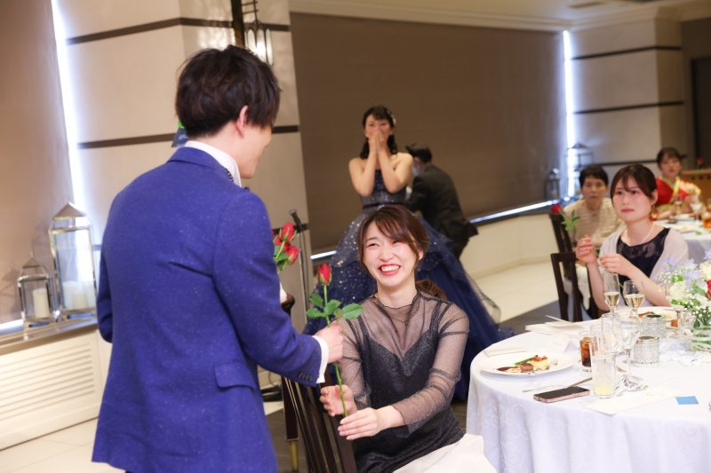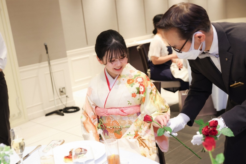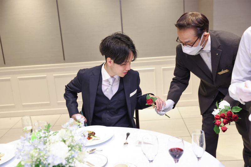 新郎新婦のお色直し中、ホテルスタッフからゲストの皆さまへ真っ赤なバラが一輪ずつ配られます。