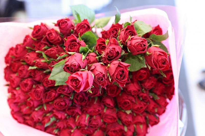 皆さまのご協力を得て出来上がったのは、100本のバラの花束!
