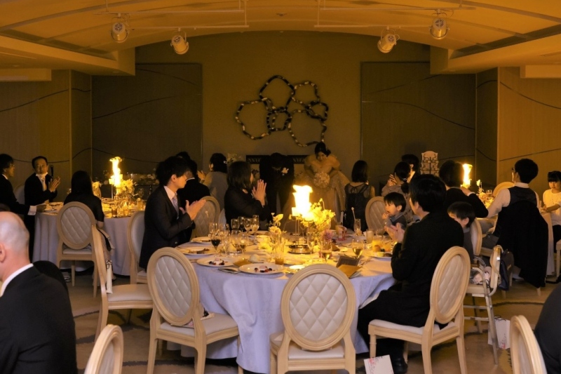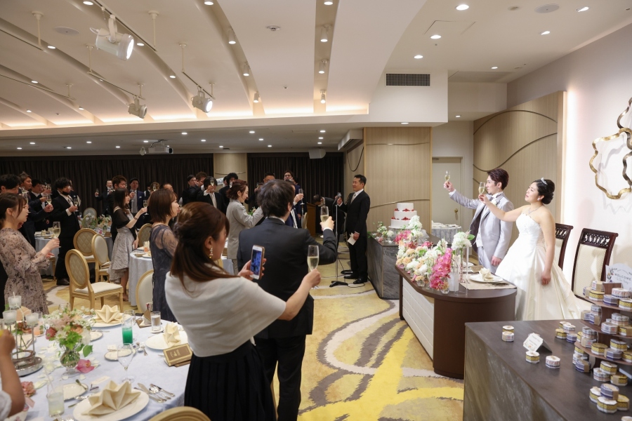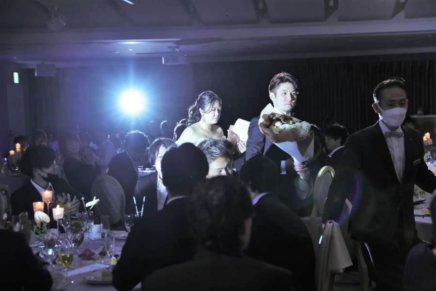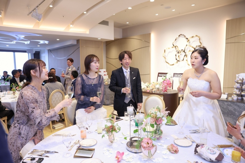 気さくなおふたりは積極的にゲストテーブルを回られ、恩師やご友人、ご親戚の皆さまを丁寧におもてなしなさいます。