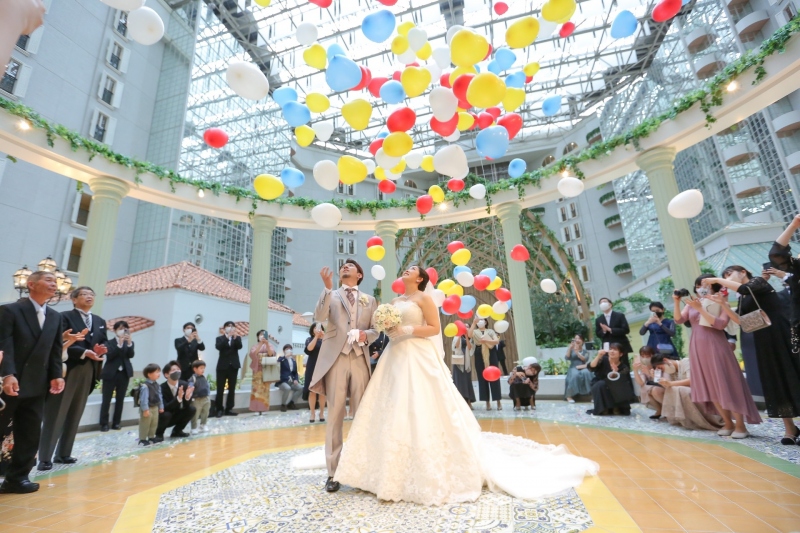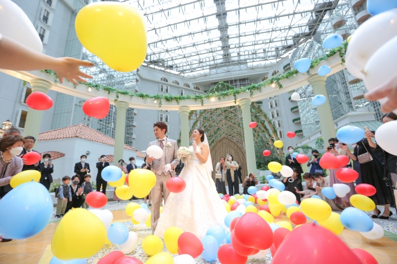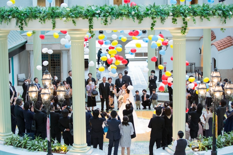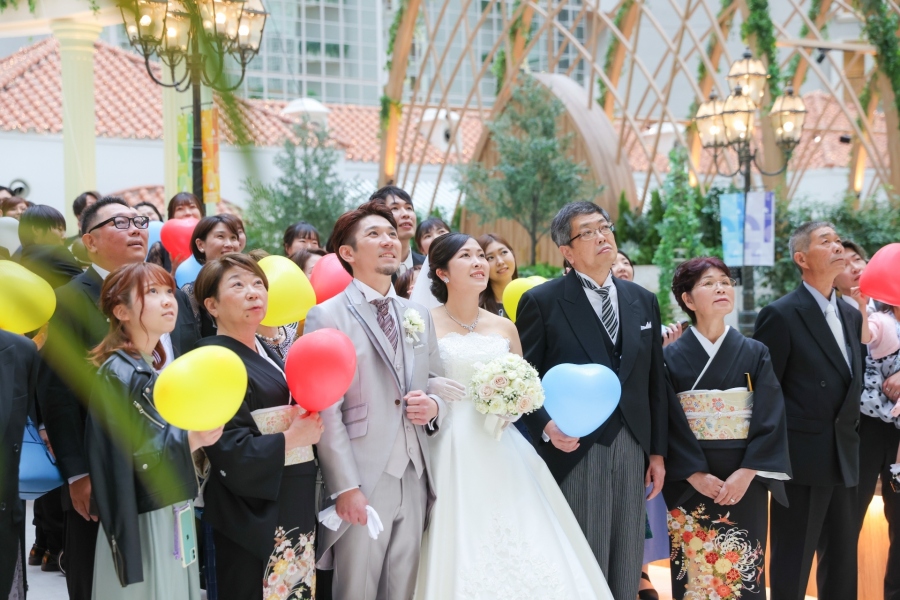 カラフルなバルーンが舞い降りると皆さまから歓声が上がり、幸せなおふたりの姿をカメラに収めていらっしゃいました。