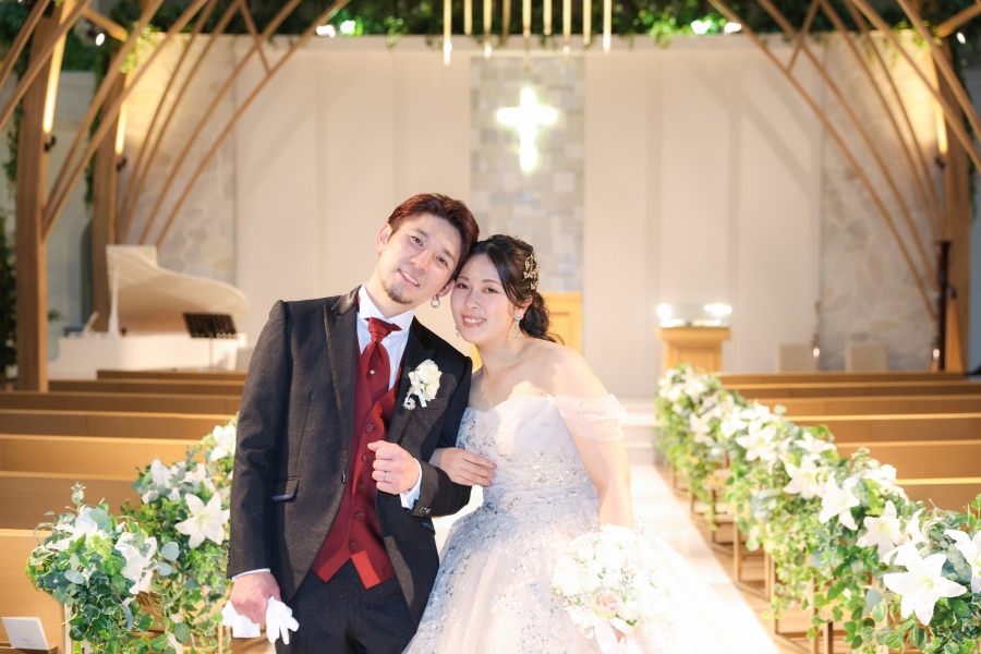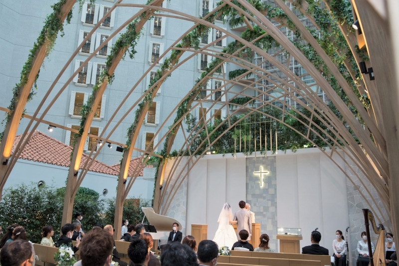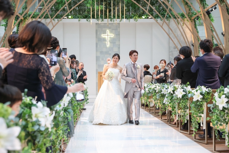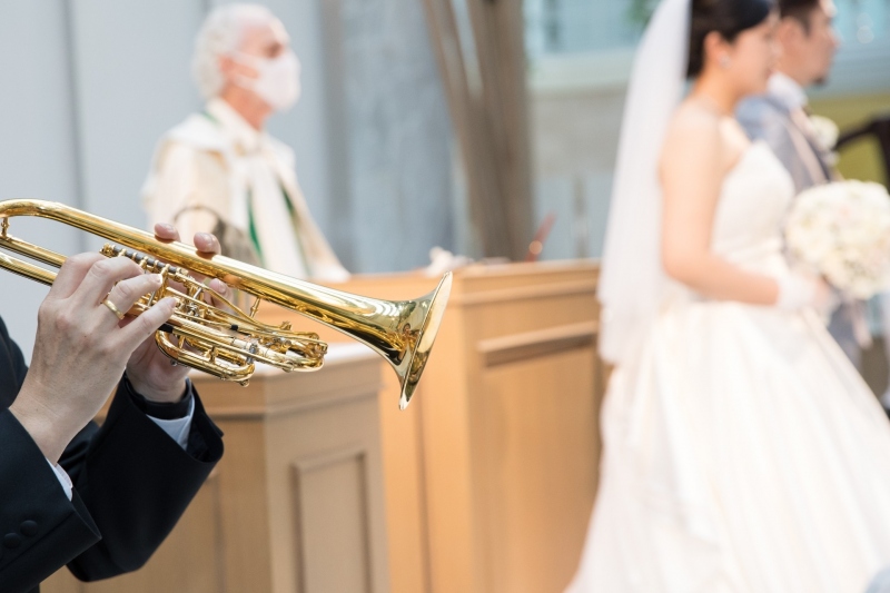 ご退場の際には新郎新婦を祝福するトランペットの音色が高らかに響きわたり、聖歌隊の歌声とグランドピアノの調べにつつまれます。