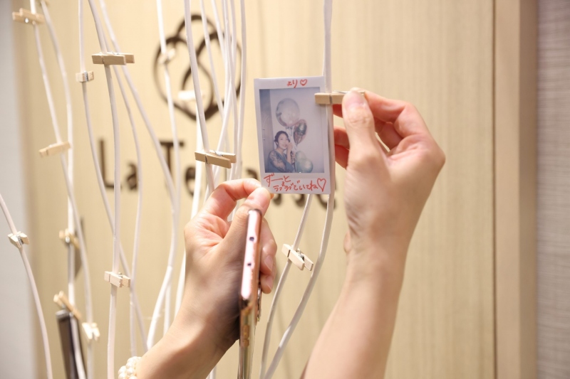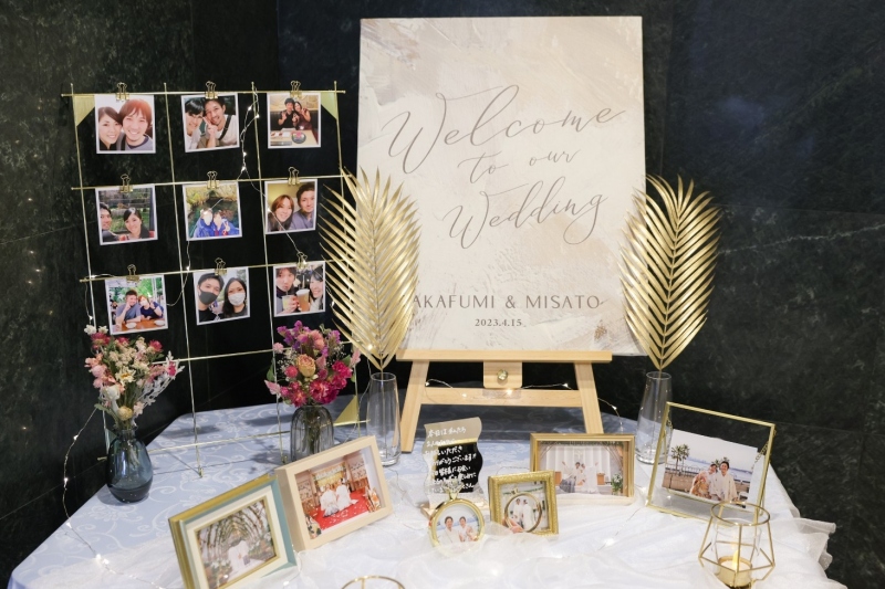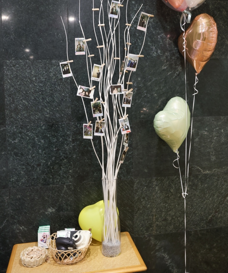 開宴をお待ちいただく間、ゲストの皆さまには受付に用意したチェキで思い思いに写真を撮り、おふたりへのメッセージを書いて、ツリーにクリップで飾り付けしていただきます。