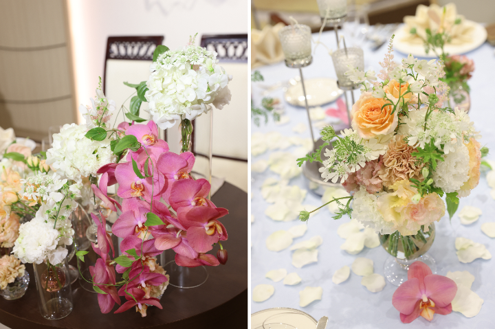 お打ち合わせを重ねる中で、全体のアクセントとして濃いピンクの花を入れたいとのリクエストから、フローリストが「幸せが飛んでくる」の花言葉を持つ胡蝶蘭をご提案したそう。