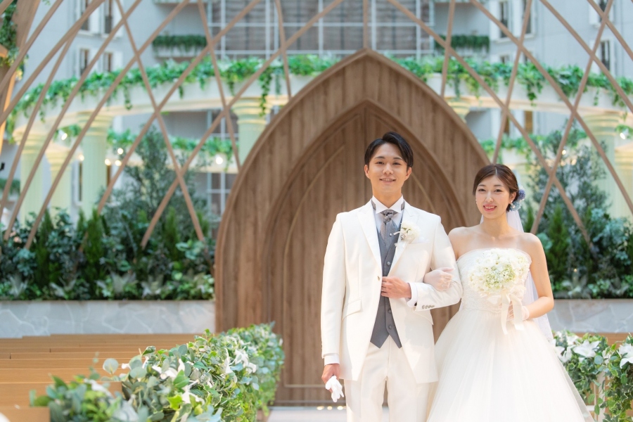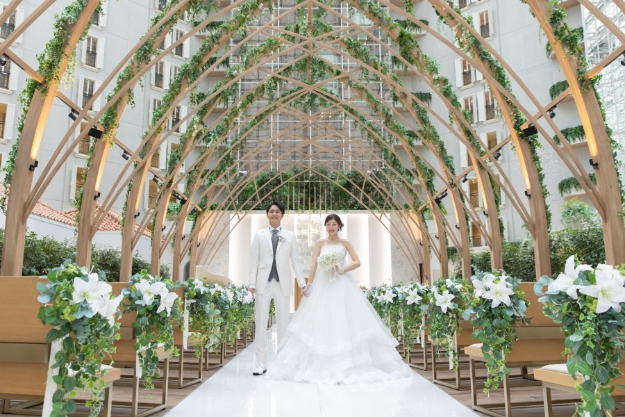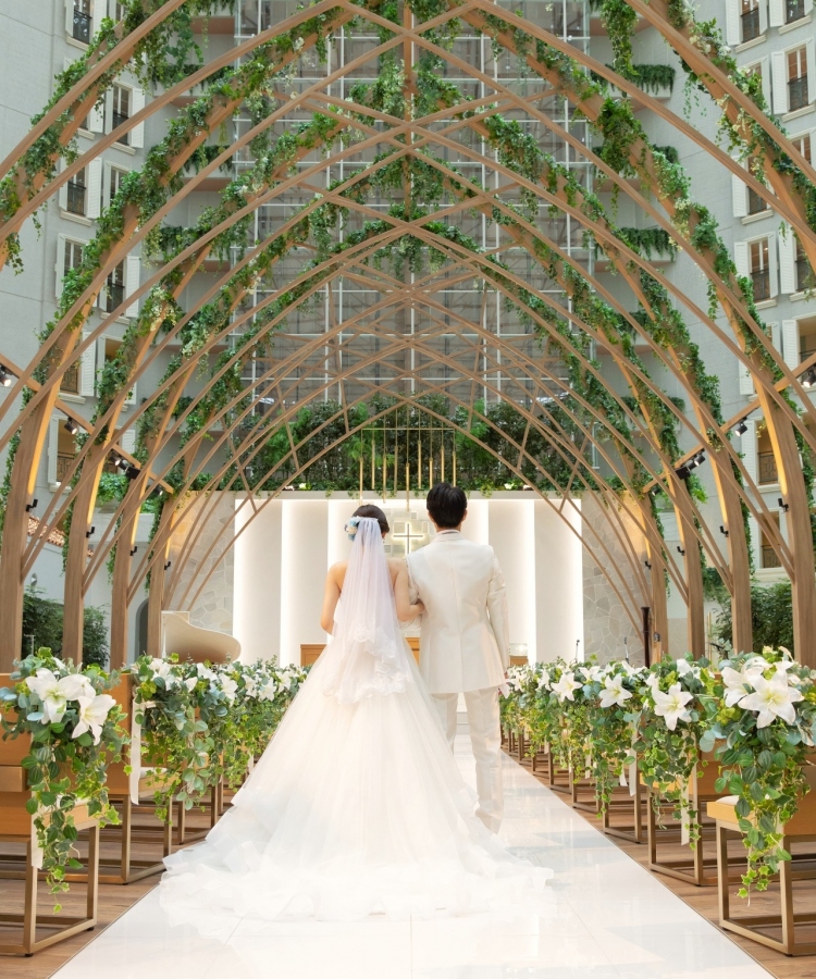 木々の温もりとつつみこむような造形美のアーチが印象的なチャペル「La Joie(ラ ジョア)」で、挙式入場を思わせるワンシーンを。