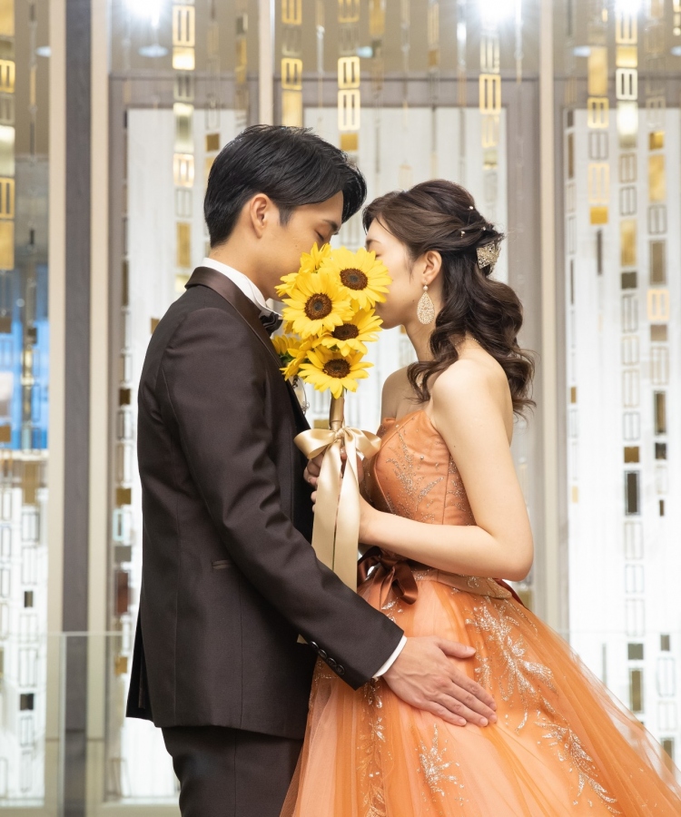 - 人気の顔隠しショットでは、鮮やかな黄色の向日葵が華を添えます。