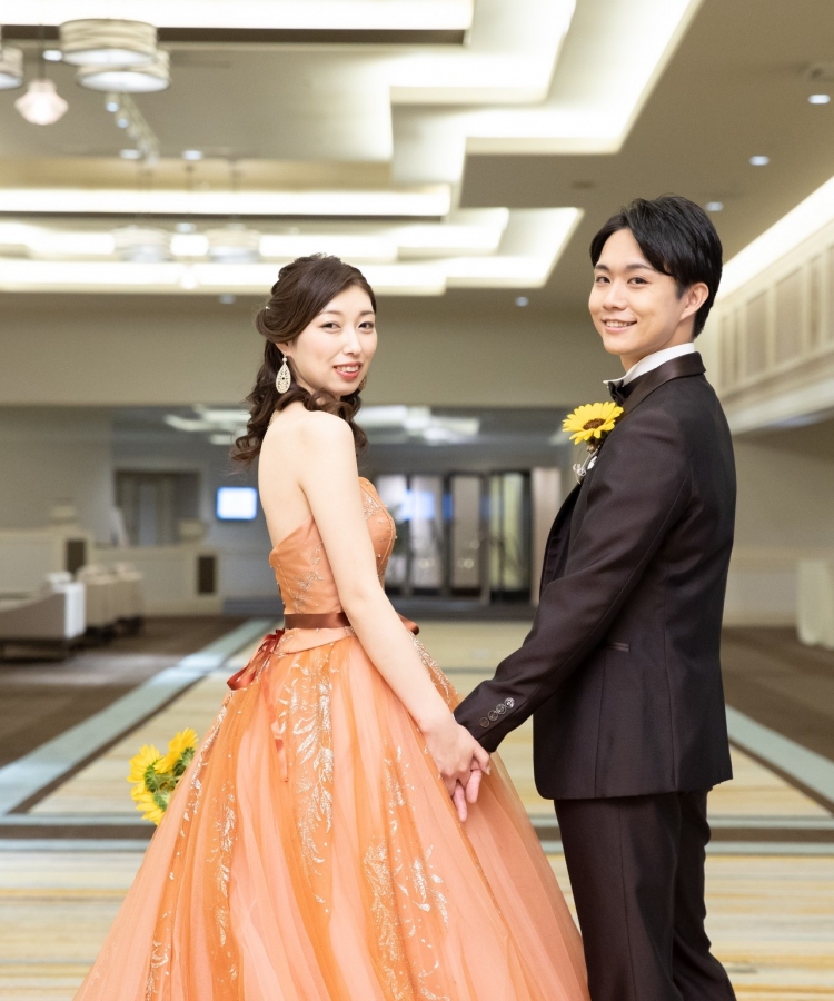 明るい陽ざしの中で撮影を楽しまれたあと、ご新婦はカラードレスへ、ご新郎ももう一着のタキシードへお召し替えなさいました。