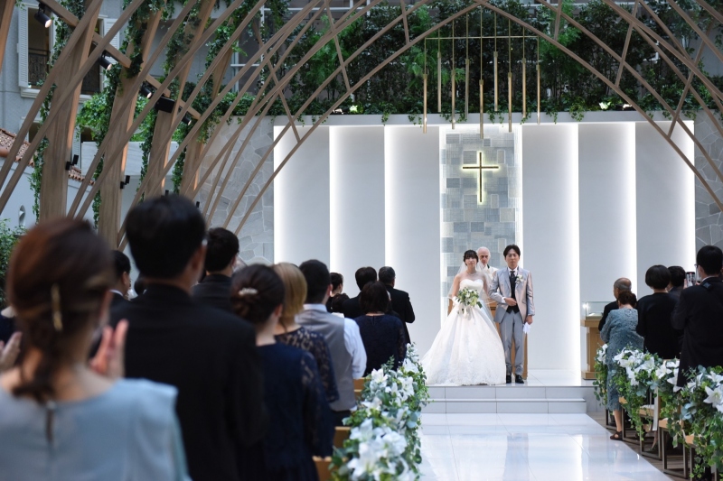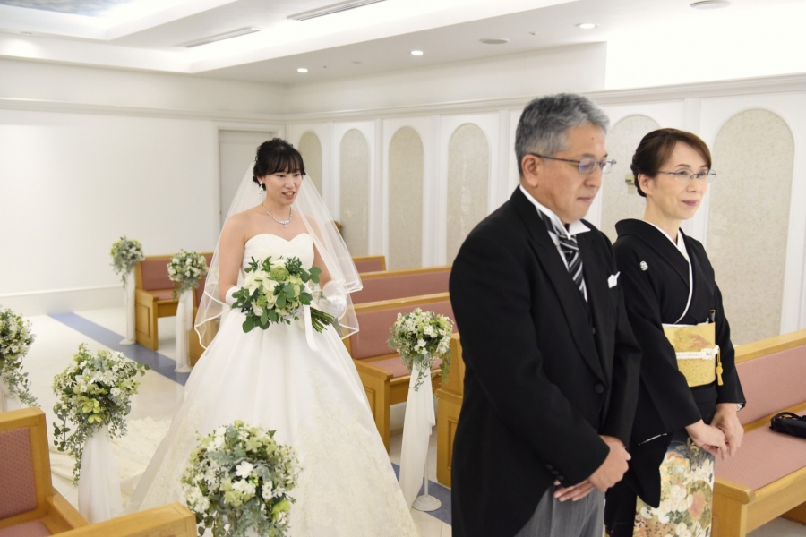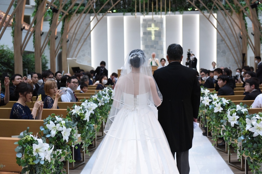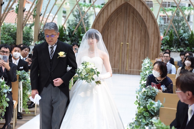 - ご両親様と過ごした日々を振り返りながら歩むバージンロード。厳かな空気がチャペルを満たします。