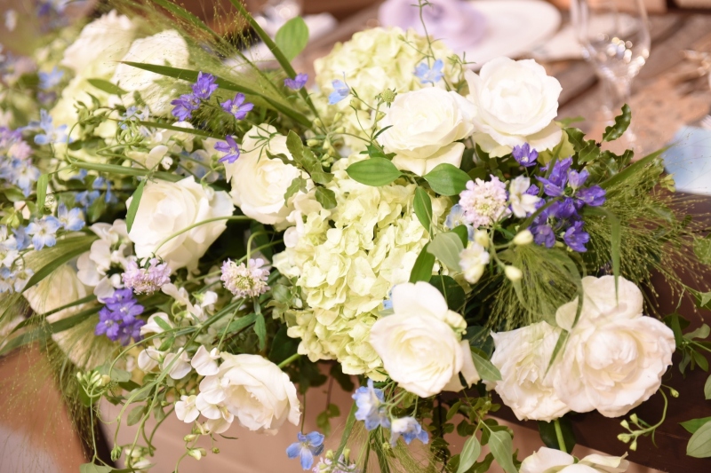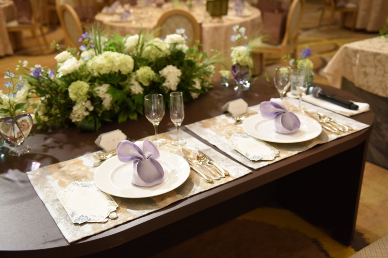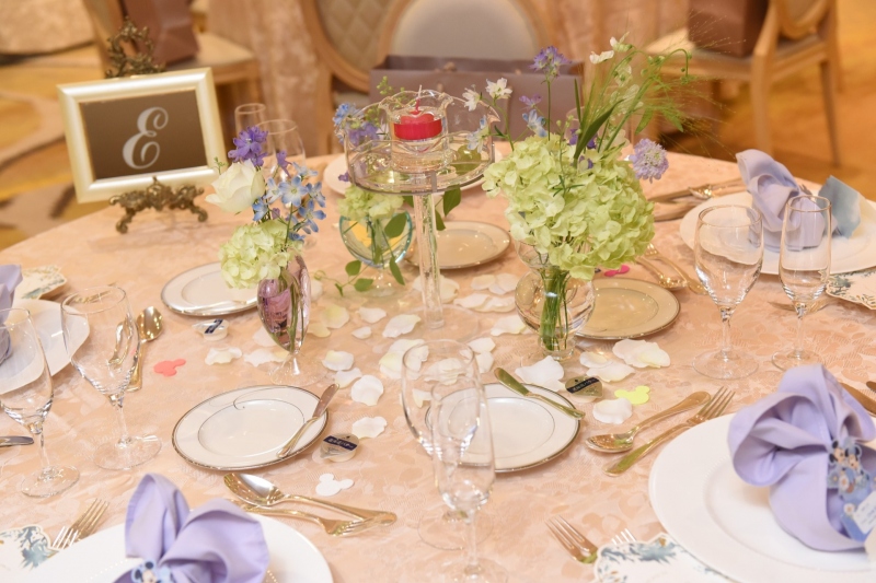 お花だけでなく花器のカラーウォーターやナフキンに取り入れた淡いパープルが、爽やかさの中に大人の落ち着きを感じさせるコーディネートです。