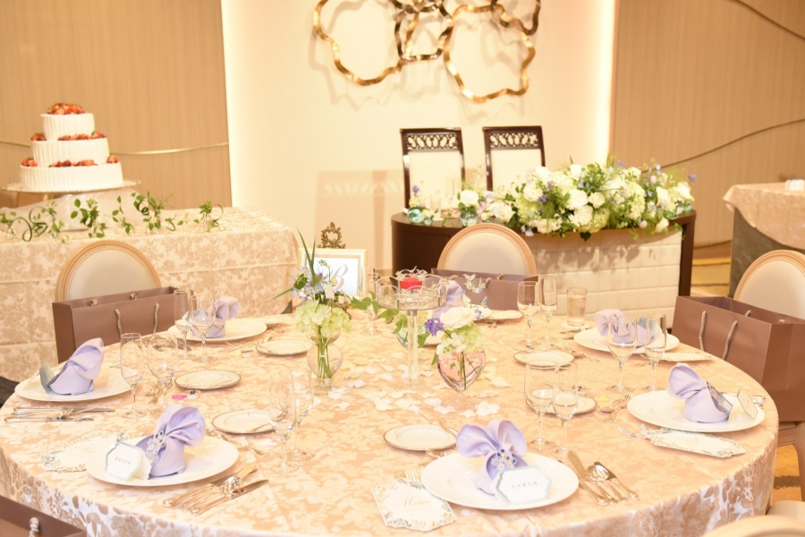 ご新婦がお好きな紫陽花色を随所に忍ばせた披露宴会場。