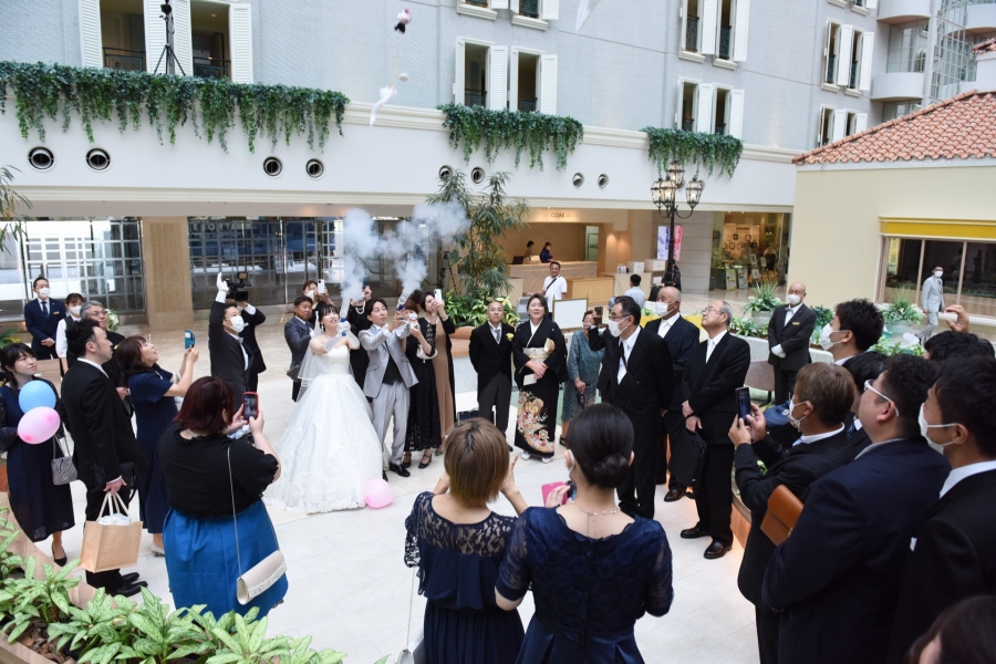 厳粛な雰囲気につつまれた挙式の後は、打って変わってチャペル併設の広場でゲストと一緒に賑やかなアフターセレモニーを楽しめるのもアトリウムウエディングの魅力。