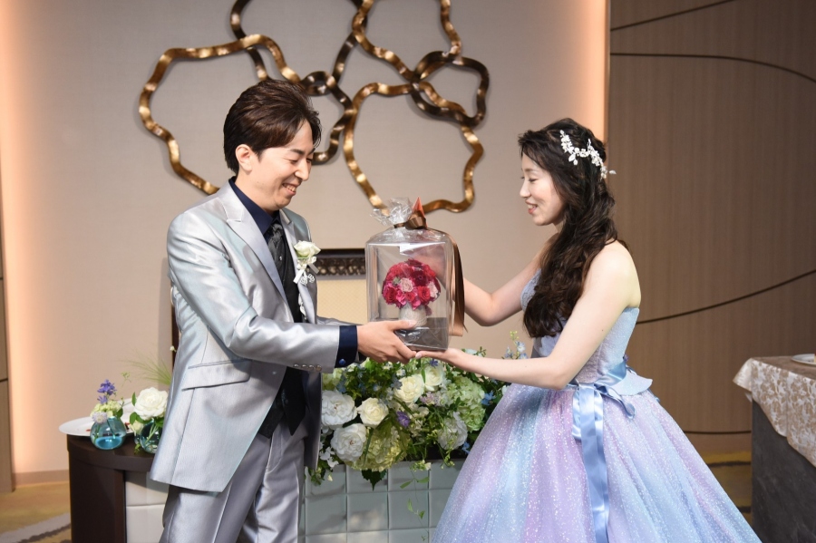 そしてご結婚の記念にと愛を込めて、永遠に色あせないプリザーブドのバラのアレンジメントをプレゼント。