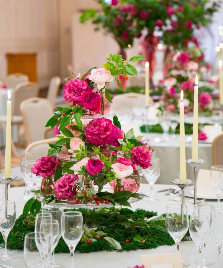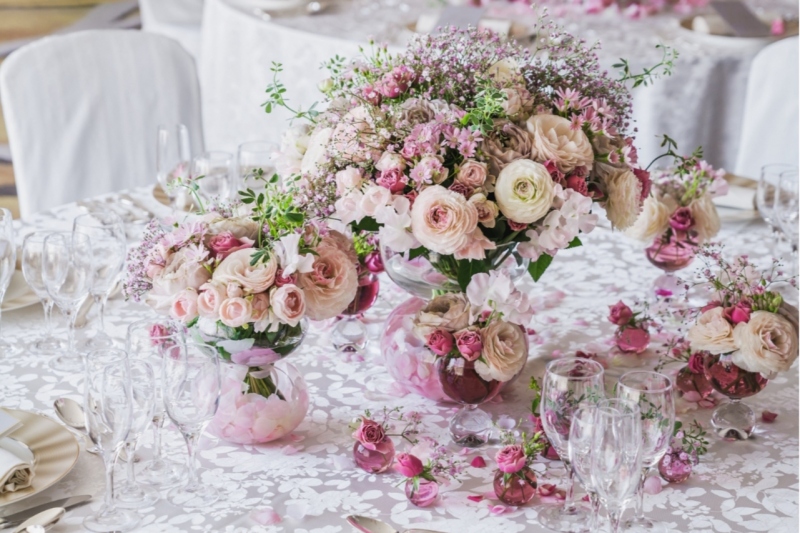 たくさんのお花が咲いている様子を表すため、テーブル装花にはコケも使用しています。