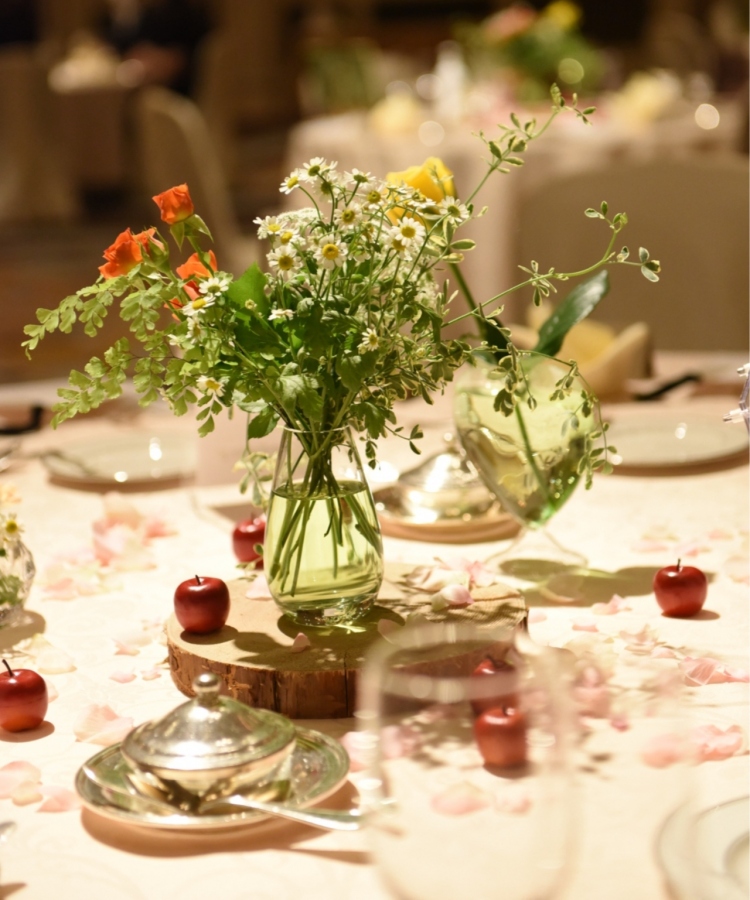 丸太や姫リンゴ、小花で、親しみやすいナチュラルさを演出しています。
