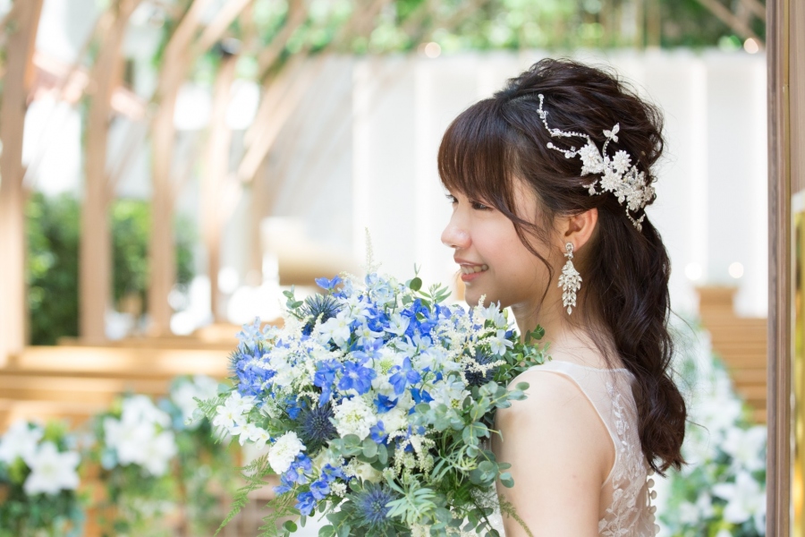 花嫁さまの持つサムシングブルーを思わせる小花を使ったブーケでさりげなくリンクさせて。