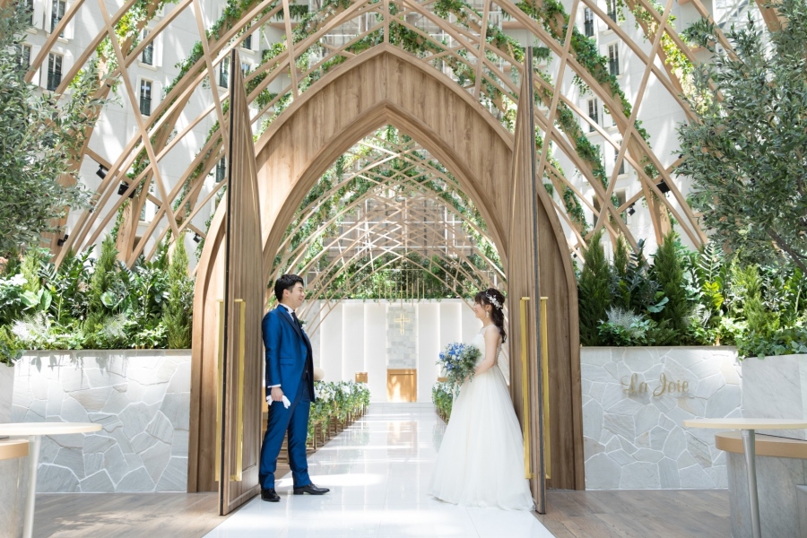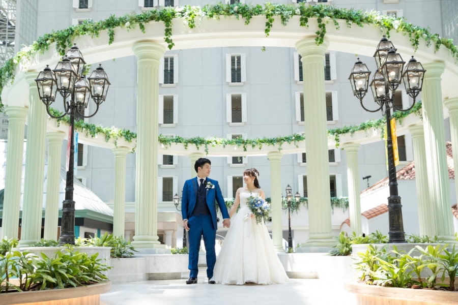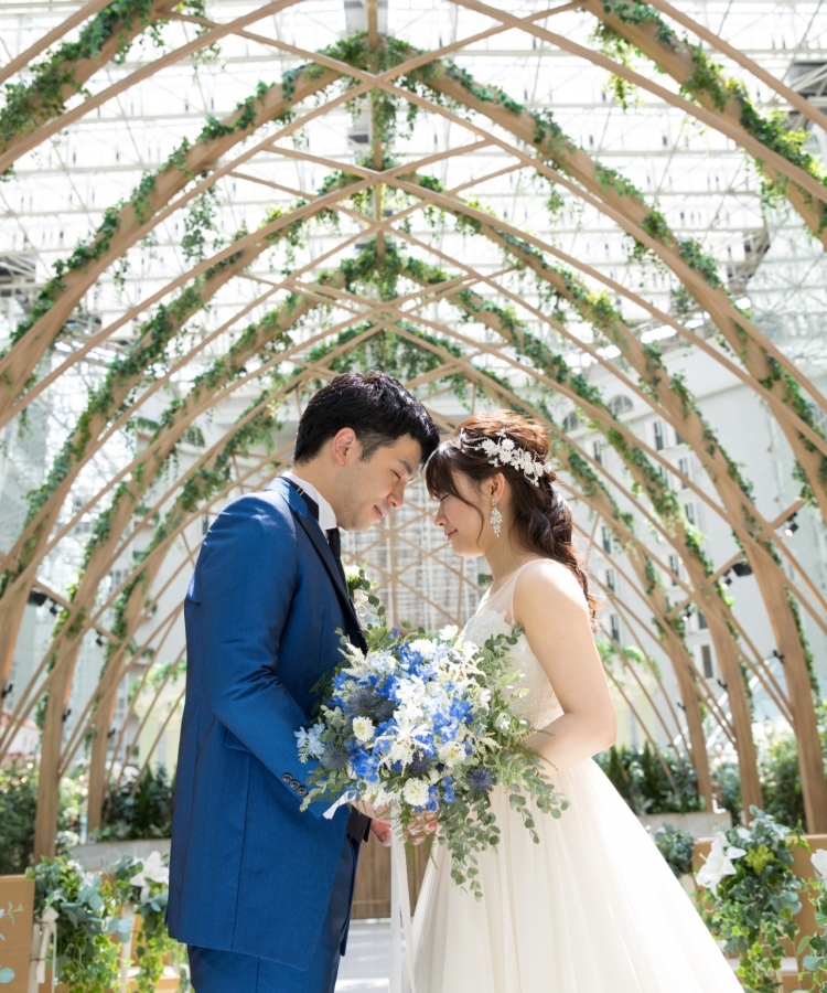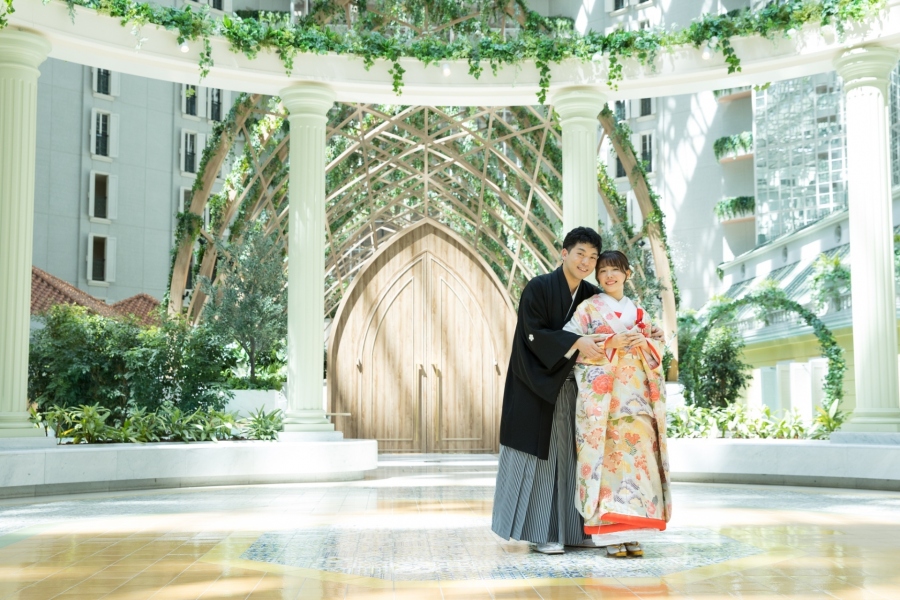 - アトリウム中央のシンボリックなガゼボで、見つめ合い、手を繋いで。