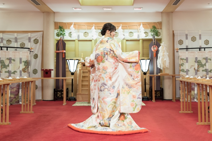 白無垢に対し、色の地や柄もふんだんに取り入れた色打掛には、鶴と四季の草花が描かれており、品格に加えて可愛らしい印象も与えてくれます。