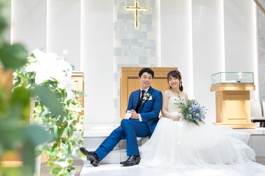 ご新郎は夏の海と空を思わせる鮮やかなブルーのシンプル&シャープなロングタキシードで爽やかに。