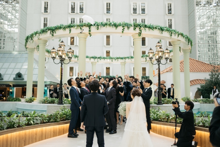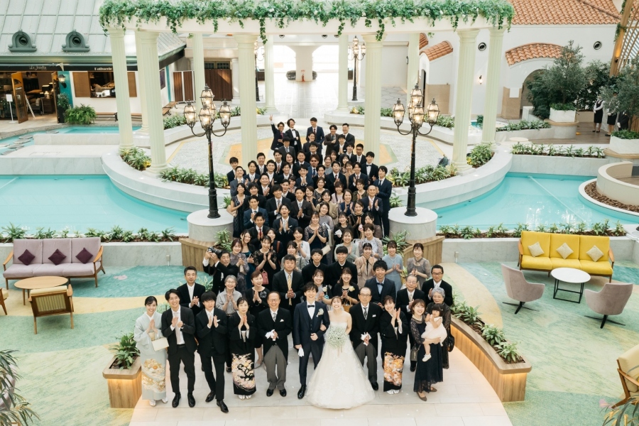 - アトリウムの広い空間を活かした上階からの集合写真で、ゲスト全員の素敵な笑顔を記念に残して。