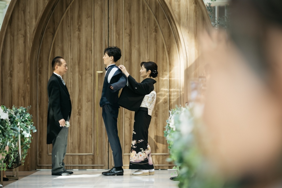 - 挙式のはじまりはご新郎とご両親様のジャケット&ブートニアセレモニーから。