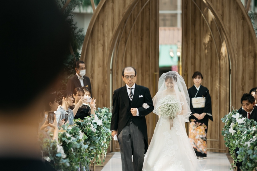 - お嬢様を花婿のもとへと送り出すご両親様と、祭壇で花嫁を迎えるご新郎を収めた素敵な1枚。