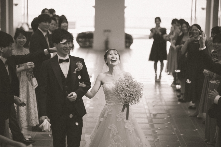 お式が無事に結び、フェザー&フラワーシャワーが舞う中を晴れてご夫婦となったおふたりが歩まれます。