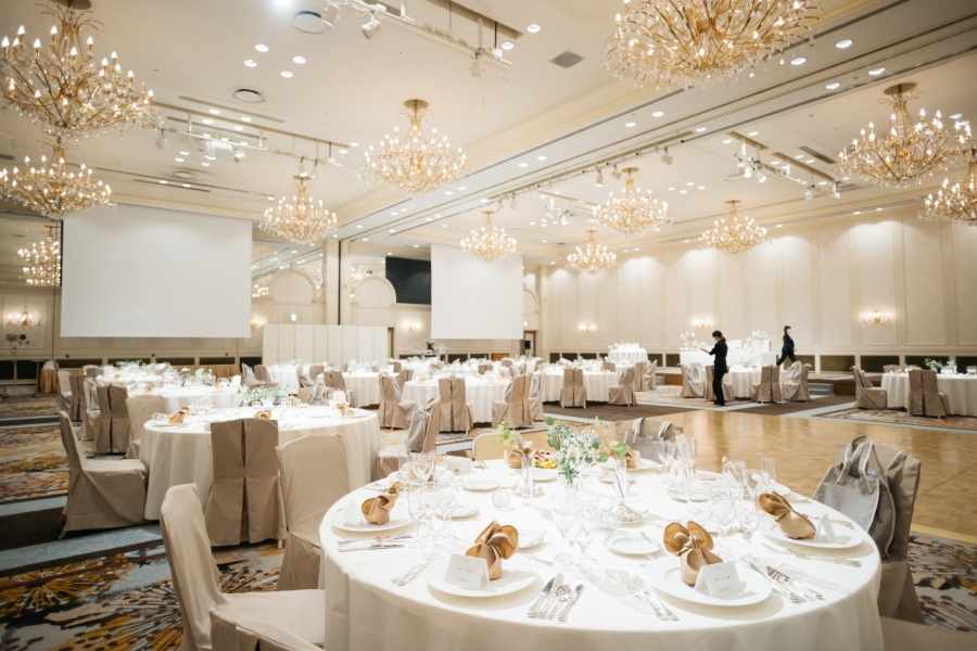 オフホワイトのクロスにベージュのナフキンで、優しく柔らかな色使いの披露宴会場。
