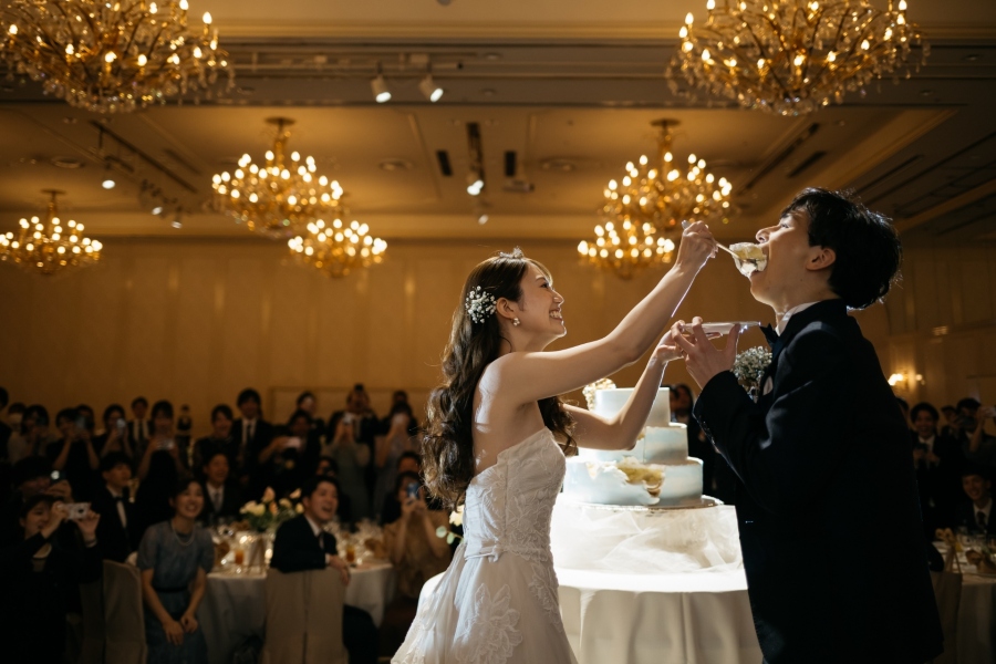 ウエディングケーキ越しのファーストバイト写真もとっても素敵ですが、反対側から撮影すると、ゲストの表情や会場の雰囲気もばっちり写真に収められます。