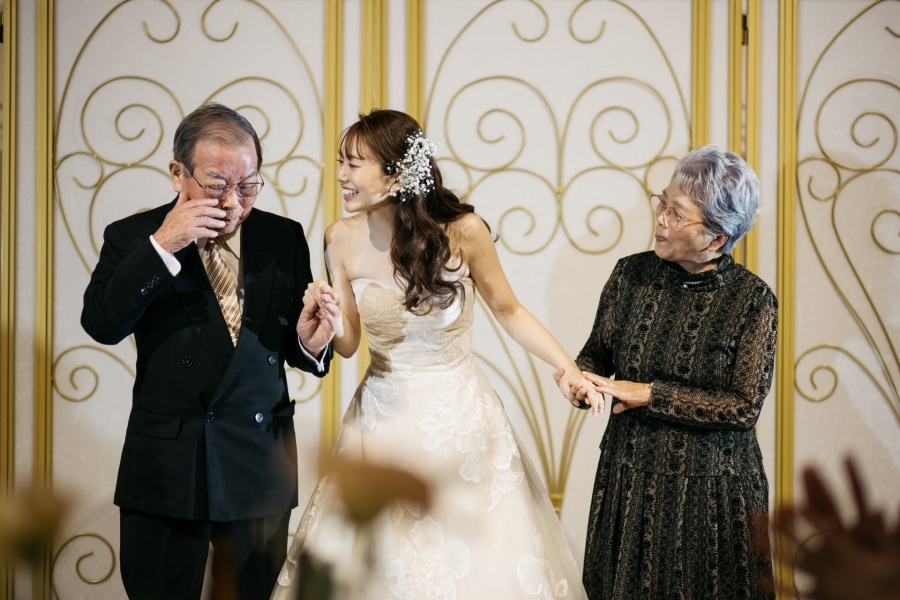 - サプライズでお色直しのエスコートをお願いされたおじい様とおばあ様。 突然のお願いに驚きつつも、立派に成長したお孫様の姿に喜びもひとしおです。