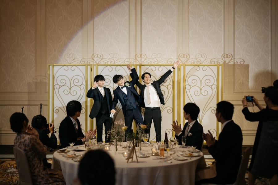 - ご新郎は3兄弟で仲良くご中座。 繋いだ手を振り上げてゲストからの声に応えるお姿に、会場からは拍手喝采!