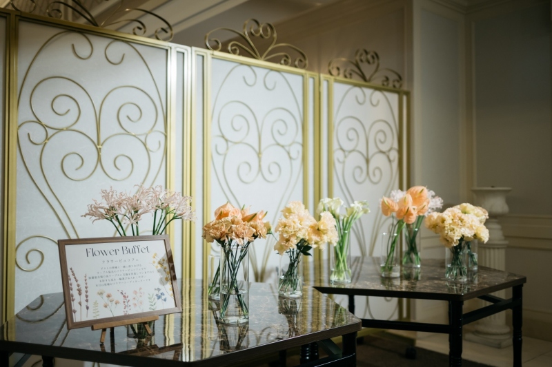 会場入口には淡いピンクやアプリコットのアンスリウムやトルコキキョウ、リコリス、カーネーションなどを少しずつ小瓶に活けたフラワービュッフェを用意して皆様にお好きなお花を選んでいただき、ゲストテーブル装花の仕上げをお手伝いいただきました。