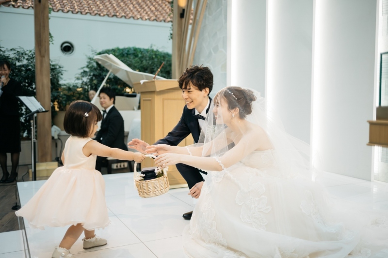 お式が無事に結び、フェザー&フラワーシャワーが舞う中を晴れてご夫婦となったおふたりが歩まれます。