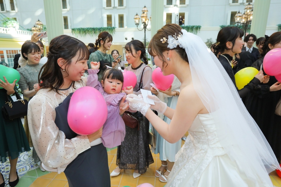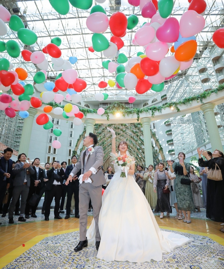 - 250個ものバルーンが、おふたりを祝福するかのように舞い降り、ゲストも手を伸ばしてキャッチしようと盛り上がります。