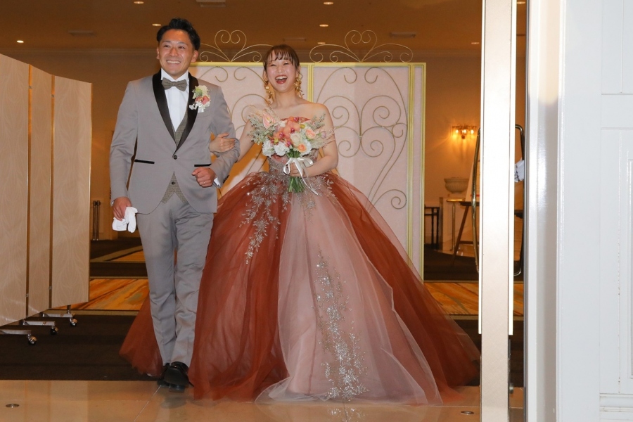 - ご新婦はテラコッタカラーのドレスへお色直し。大歓声に迎えられ、最高の笑顔。