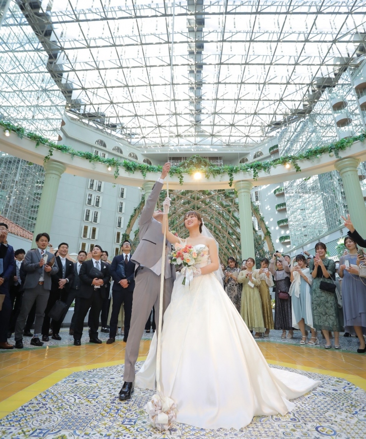 - 皆様の期待が高まる中、新郎新婦が息を合わせて天井から伸びるリボンを引くと…