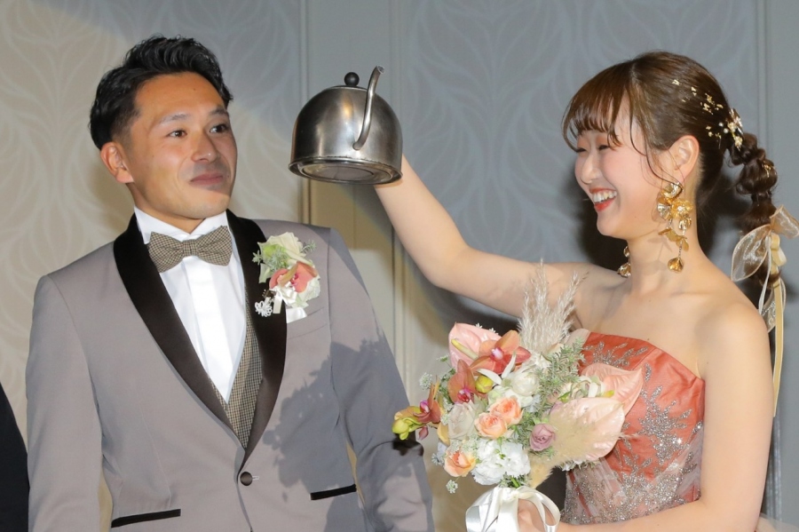 - 高砂まで進むと、おふたりが用意したケトルが登場。まるで魔法のランプのようにこすると…
