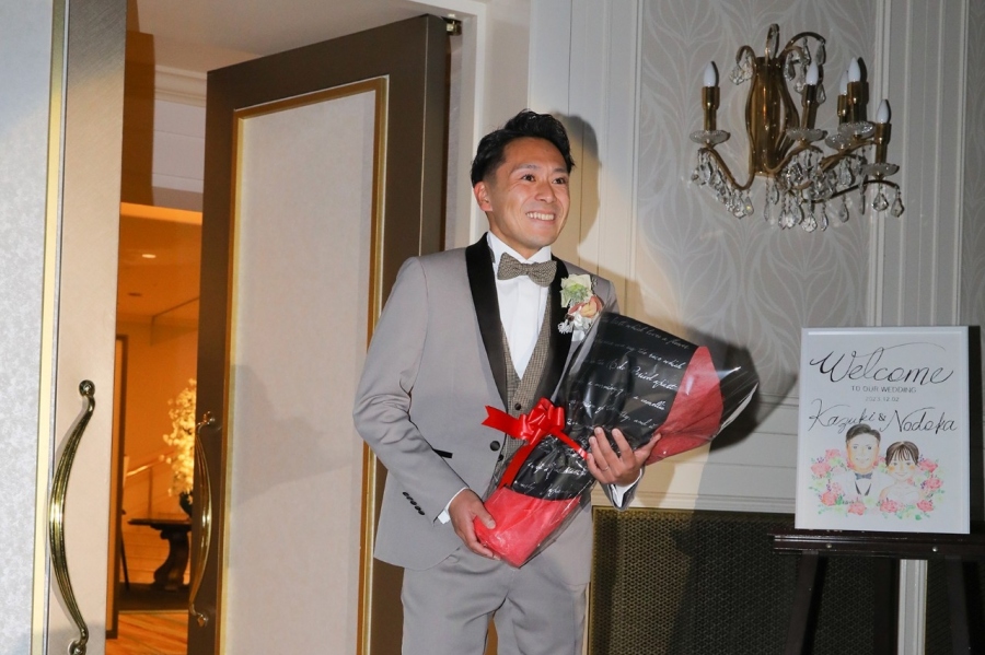 - すると会場の扉が開き、大きなバラの花束を手にしたご新郎が登場!