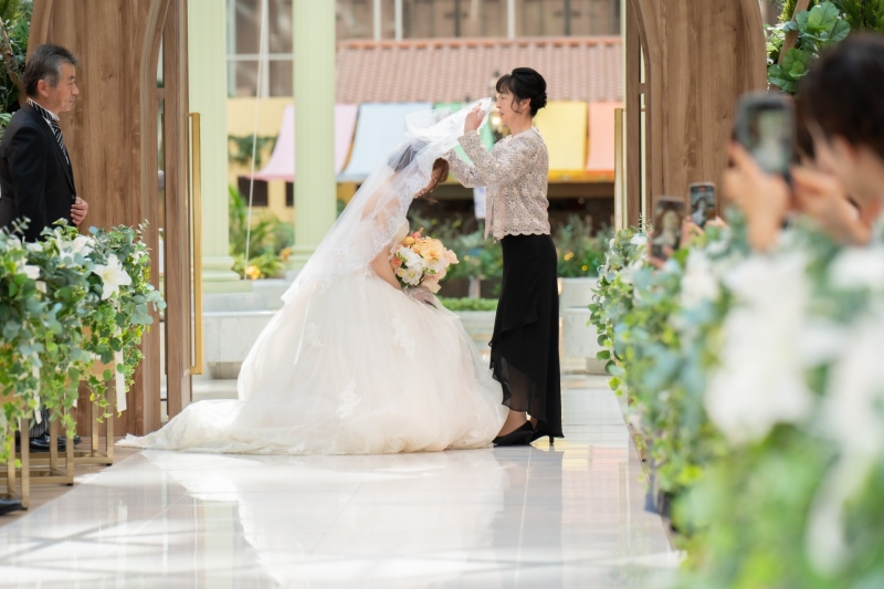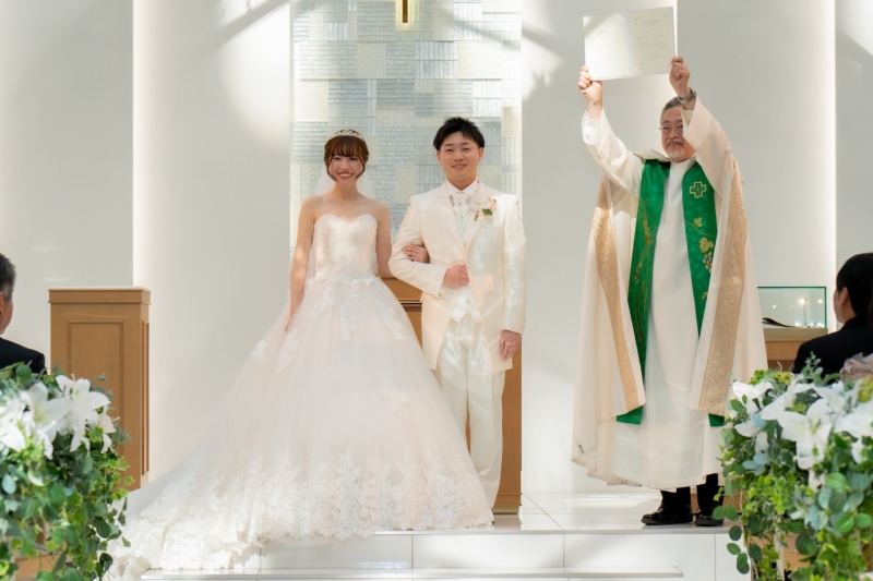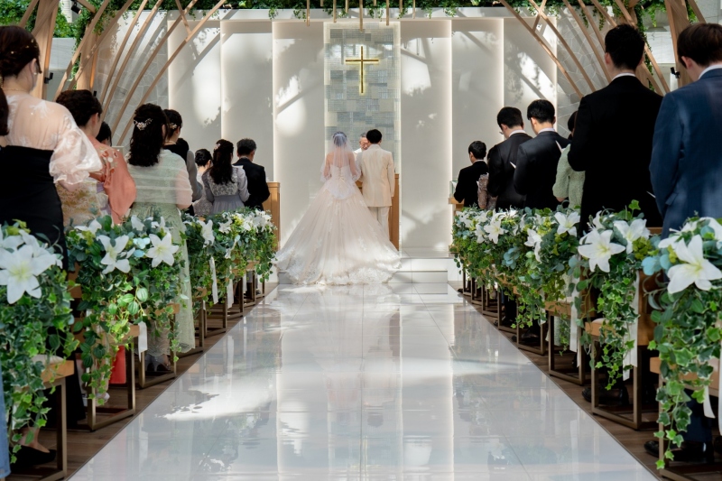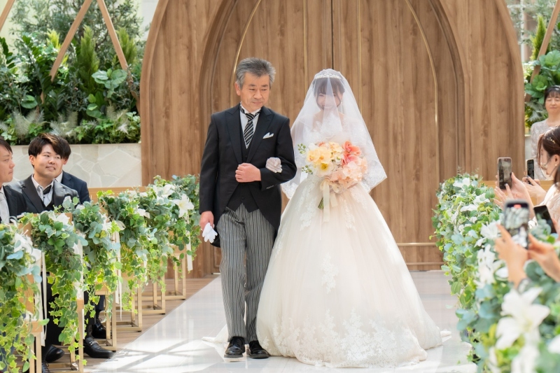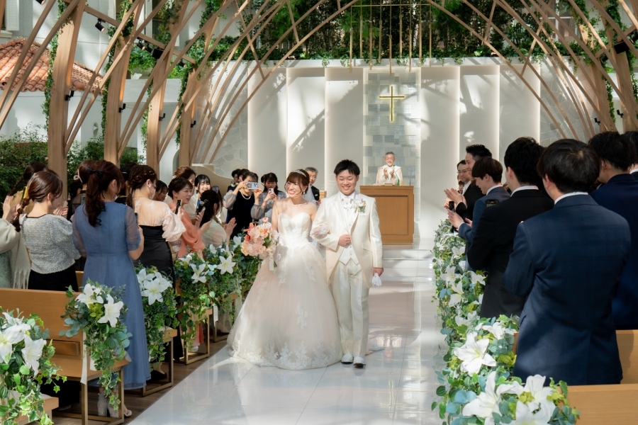 空気が澄んだ冬晴れの日、チャペルにはやわらかな陽ざしが降りそそぎ、ご列席の皆様からの祝福と笑顔につつまれる和やかな挙式となりました。