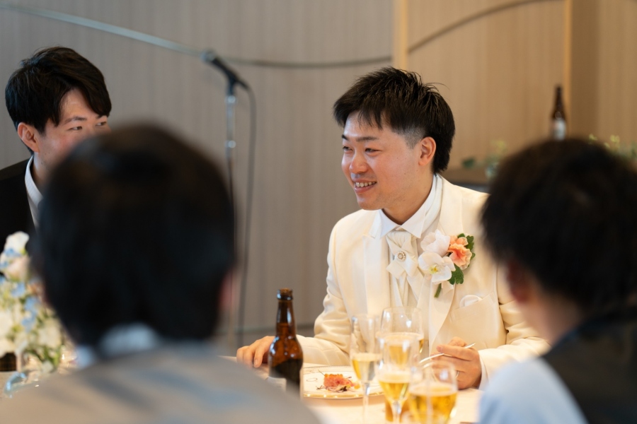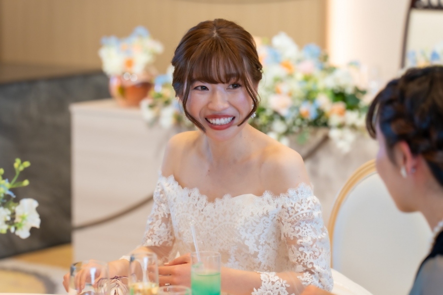 ご披露宴の後半もゲストとのお食事の続きやフォトラウンド、ご友人作成のお祝いムービーを皆様でご鑑賞するなど、笑顔のたえない時間を皆様と一緒に楽しまれました。