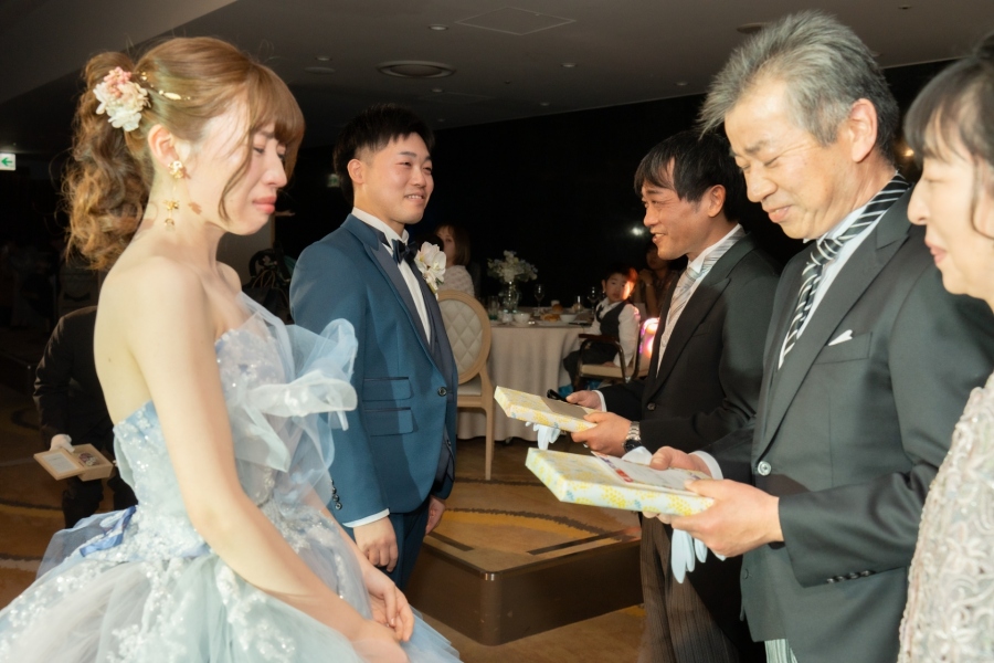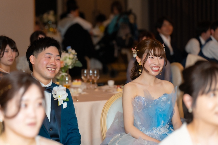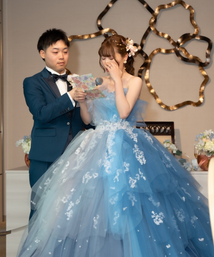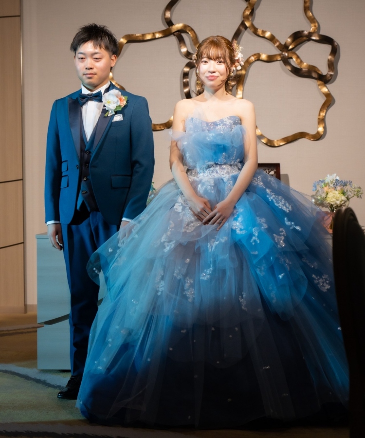 新郎新婦ともに純白から爽やかなブルーへとお色味を合わせ、ここでも仲睦まじさが伝わるお色直しとなりました。