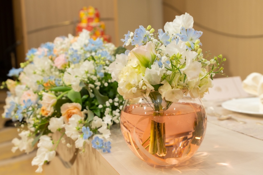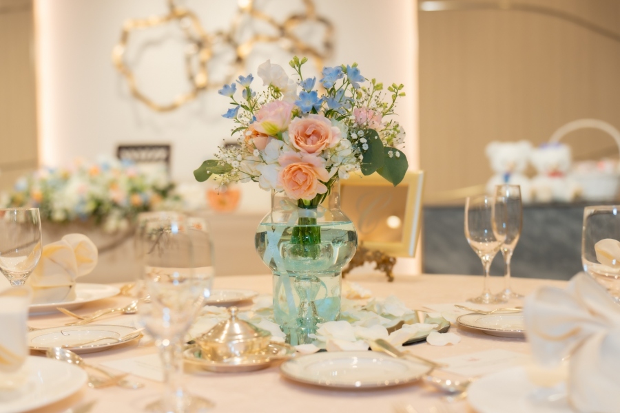 最上階のスカイバンケット「ラ テラス」で行われたご披露宴では、テーブルクロスとナフキンを上品な白でまとめ、淡いブルーとオレンジが引き立て合う装花で、大人かわいいコーディネートに。