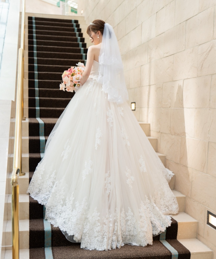 - ケミカルレース風のチュールが華やかなウエディングドレス。