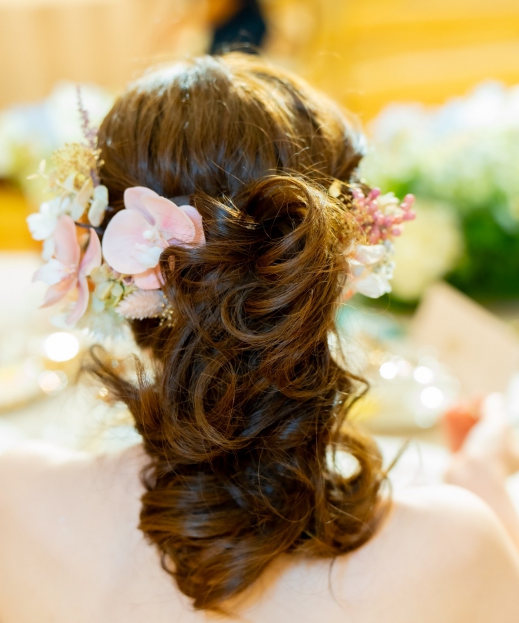 - フワフワのウェーブヘアにはドレスのお色味に映えるオレンジやピンクのヘッドドレスを合わせて。