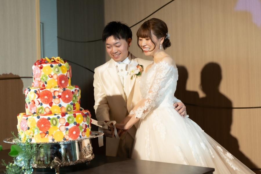 - 瑞々しいフルーツをたっぷり使ったインパクト絶大のウエディングケーキはゲストからも大好評。