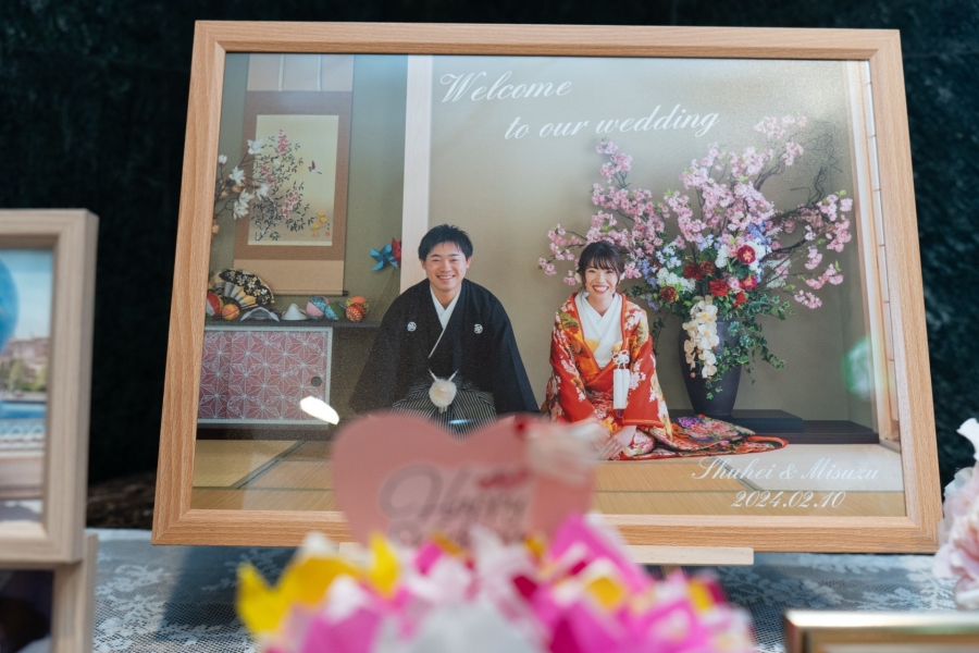 - 和装での前撮り写真を使ったウエルカムボードや思い出のお写真を会場内に飾り、皆様にご覧いただきました。