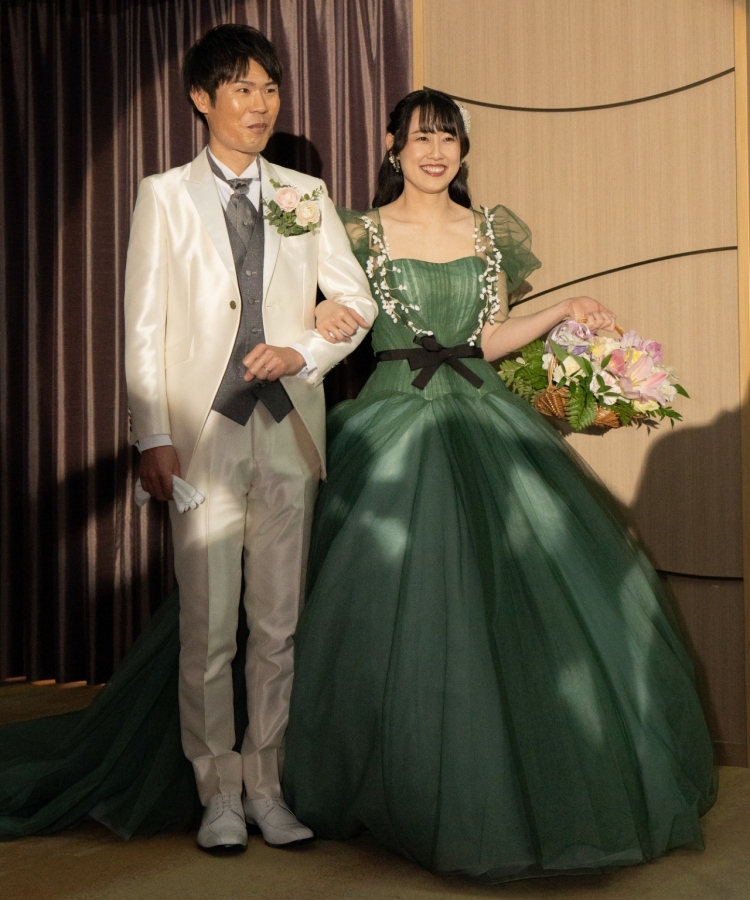 お色直しのカラードレスは、KIYOKO HATA(キヨコハタ)のグリーンドレス。