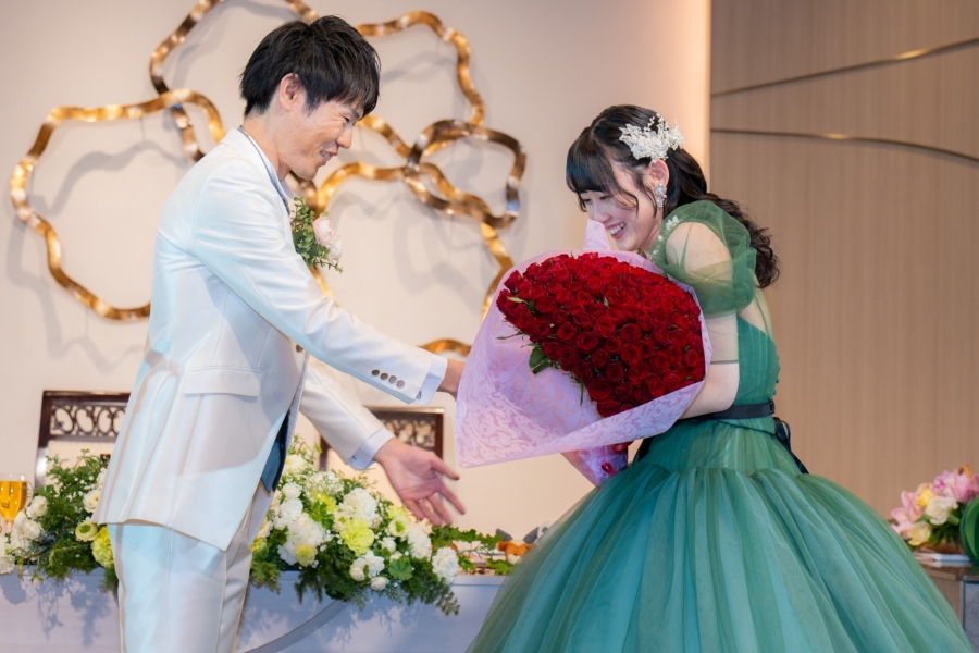ご披露宴が結びにさしかかる頃、ご新郎からご新婦へお手紙を読み上げると、100本ものバラの花束をサプライズでプレゼントなさいました。