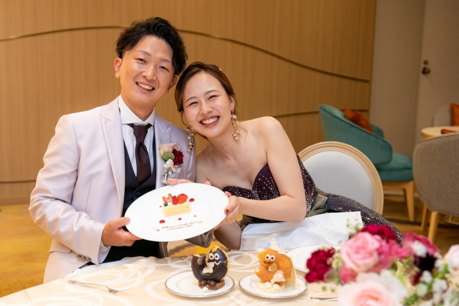 - ご新婦からのサプライズで、デザートプレートに「お嫁さんにしてくれてありがとう」のメッセージを添えて。思いがけない感謝の言葉にご新郎もとっても嬉しそう!