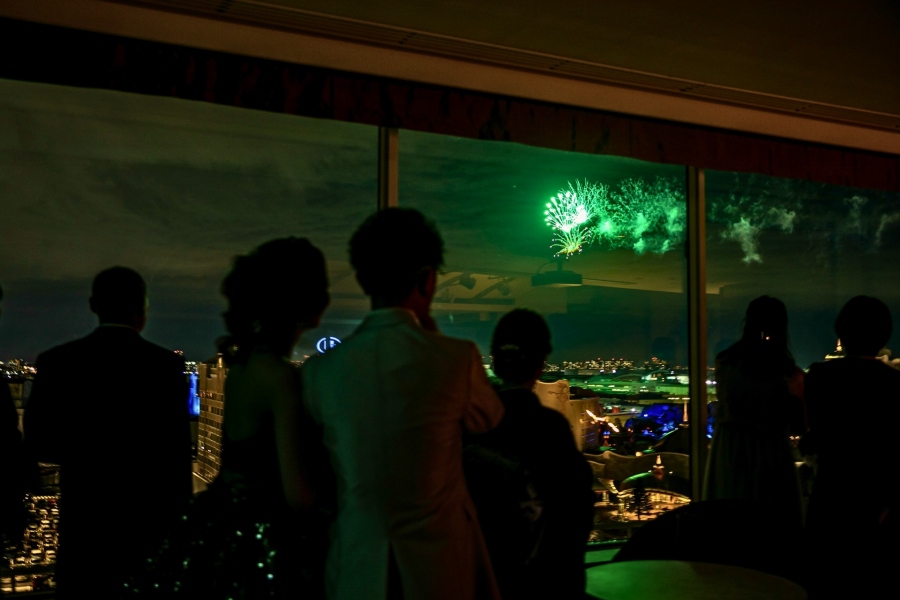 - ご披露宴のお開き直後には、パークから打ちあがる花火を皆様とご鑑賞。ゲストは当館にご宿泊なさって夢の続きをお部屋でゆっくりと楽しまれました。