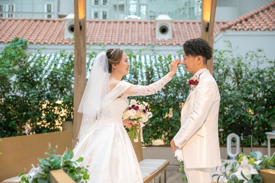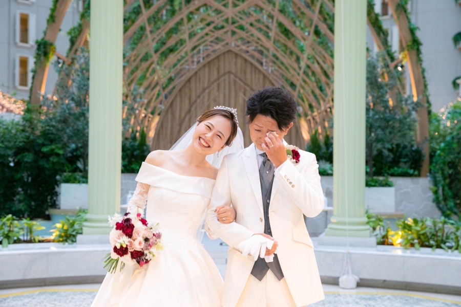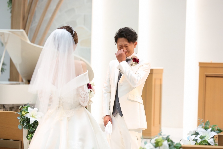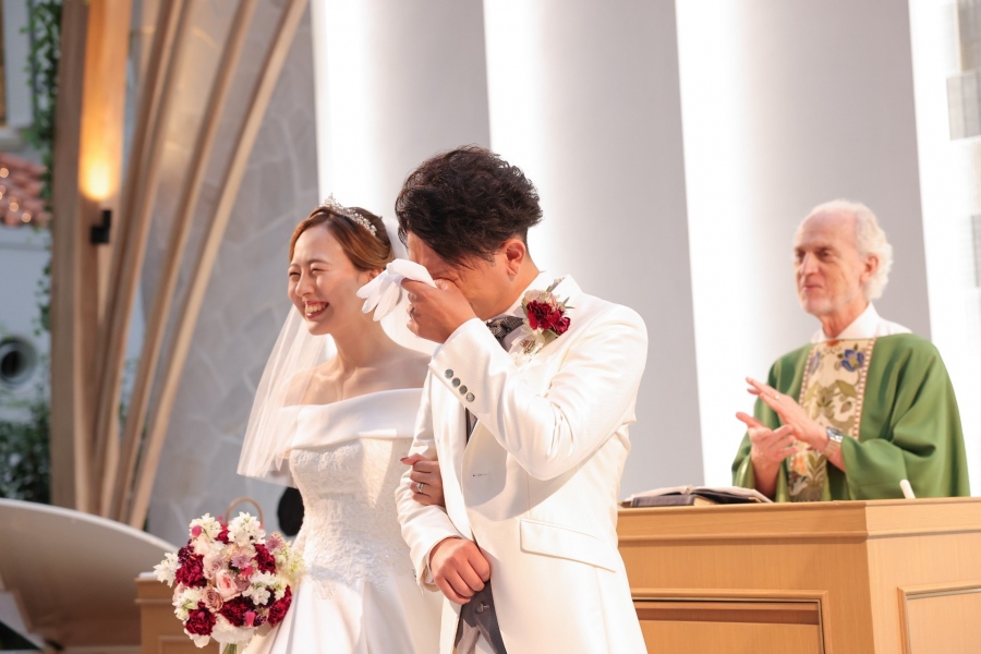 - 牧師からおふたりの結婚が高らかに宣言されると、感極まったご新郎は涙を隠せません。