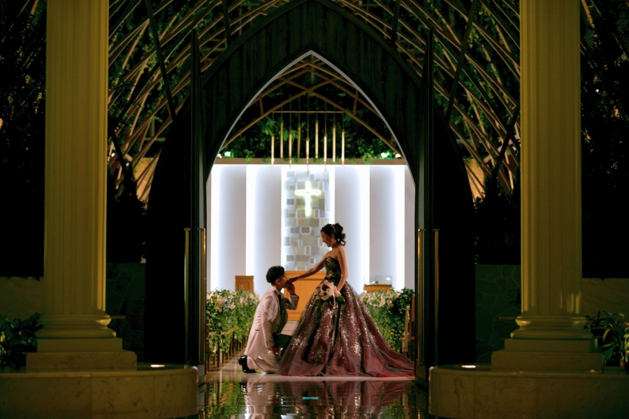 - 6月の夕方に執り行われた挙式。お天気に左右されないチャペルがお気に召していただけたそう。